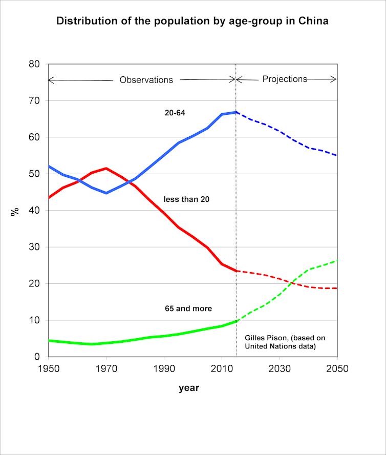 When fertility falls rapidly in a country, the proportion of children decreases sharply while the share of older adults initially remains quite low (see figure below for China).